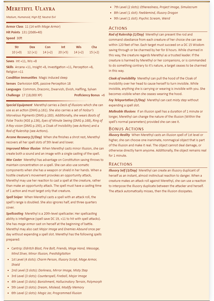 Additionally, there are some DMs which prefer having a party created before creating their villain, so they can tune them specifically to the party. This is an approach I'm not personally fond of because if you have a situation where the party composition changes or they simply evolve in an unexpected way, they can ruin your plans. When creating Merethyl, I had planned on her being embedded in the setting before a party is created. I spent roughly an hour drafting her outline, then It took me an evening to get her information written down and formatted into a stat block.